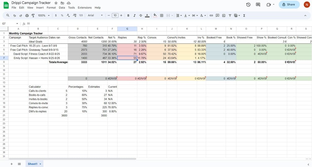 An Excel Spreadsheet to help you track all your Drippi Campaigns and return back conversion metrics, estimate how successful your campaigns could be, and show you where people are getting stuck along the way.